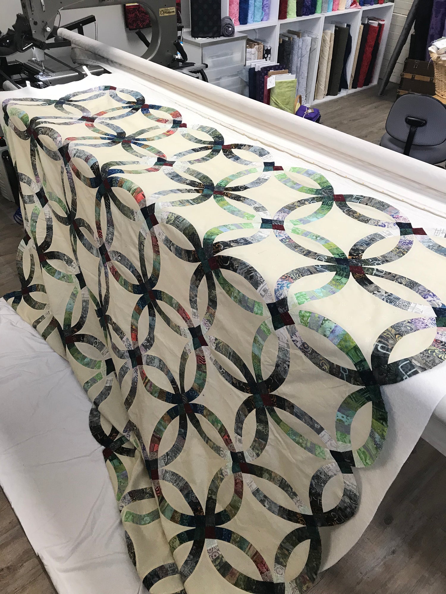Custom quilting involves many decisions; backing, batting, thread and design. With over 25 years of quilting experience and more than 5000 quilts under our belt, we are well suited to help you make those decisions.