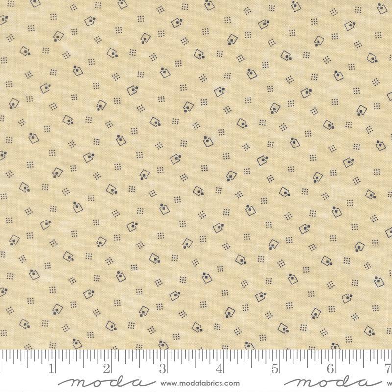 The color palette is a soft, earthy blend of warm tans, creamy neutrals, light blues, and soothing tonals, creating a calm and inviting atmosphere. 100% cotton, 44/45" wide