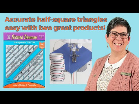 An easy, efficient & accurate method to square-up half-square triangles.  Align the seam of an unpressed hst with dashed lines and with easy strokes, trim all four sides.  The unique edge slots allow for trimming of the dog ears at the same time.  No need to rotate fabric to realign.