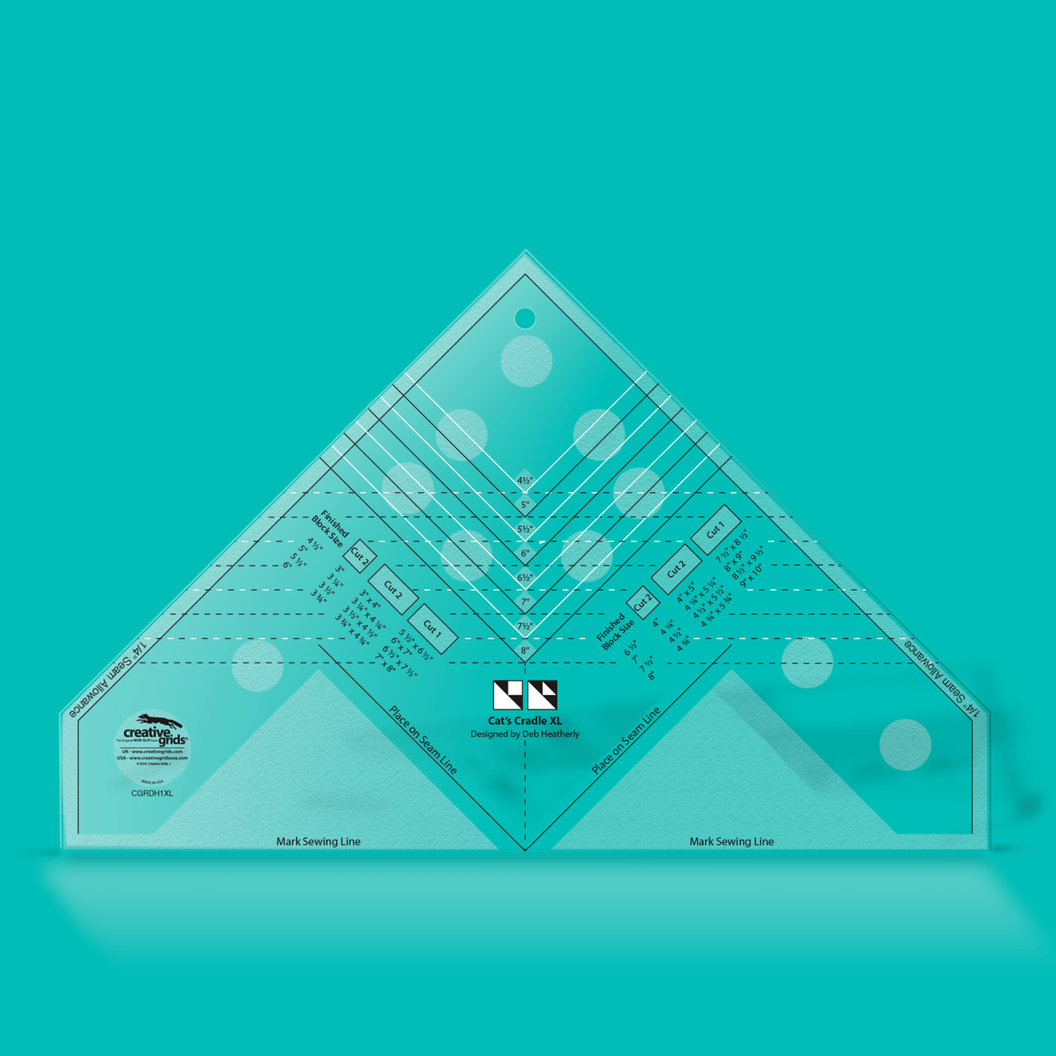 Make Cats Cradle units quickly, easily and accurately, two at a time from squares and rectangles. You never cut a single triangle, but with the Cats Cradle tool you end up with perfect triangles in your finished blocks every time. Create six sizes from 1 1/2 to 4 inch finished blocks - the cutting requirements for each is printed right on the ruler!