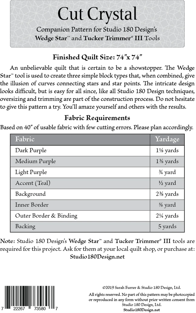 An unbelievable quilt that is certain to be a showstopper. The Wedge Star™ tool is used to create three simple block types that, when combined, give the illusion of curves connecting stars and star points. The intricate design looks difficult, but is easy for all since, like all Studio 180 Design techniques, oversizing and trimming are part of the construction process. Do not hesitate to give this pattern a try. You’ll amaze yourself and others with the results.