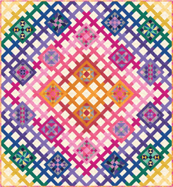 This project features Sarah Maxwell’s new collection of dimensional blenders with a unique abstract motif. Spanning the color wheel, the fantasy prints include a great black, grey and off-white, along with an assortment of warm and cool colors that blend together perfectly. The two multicolor prints tie the color wheel together.