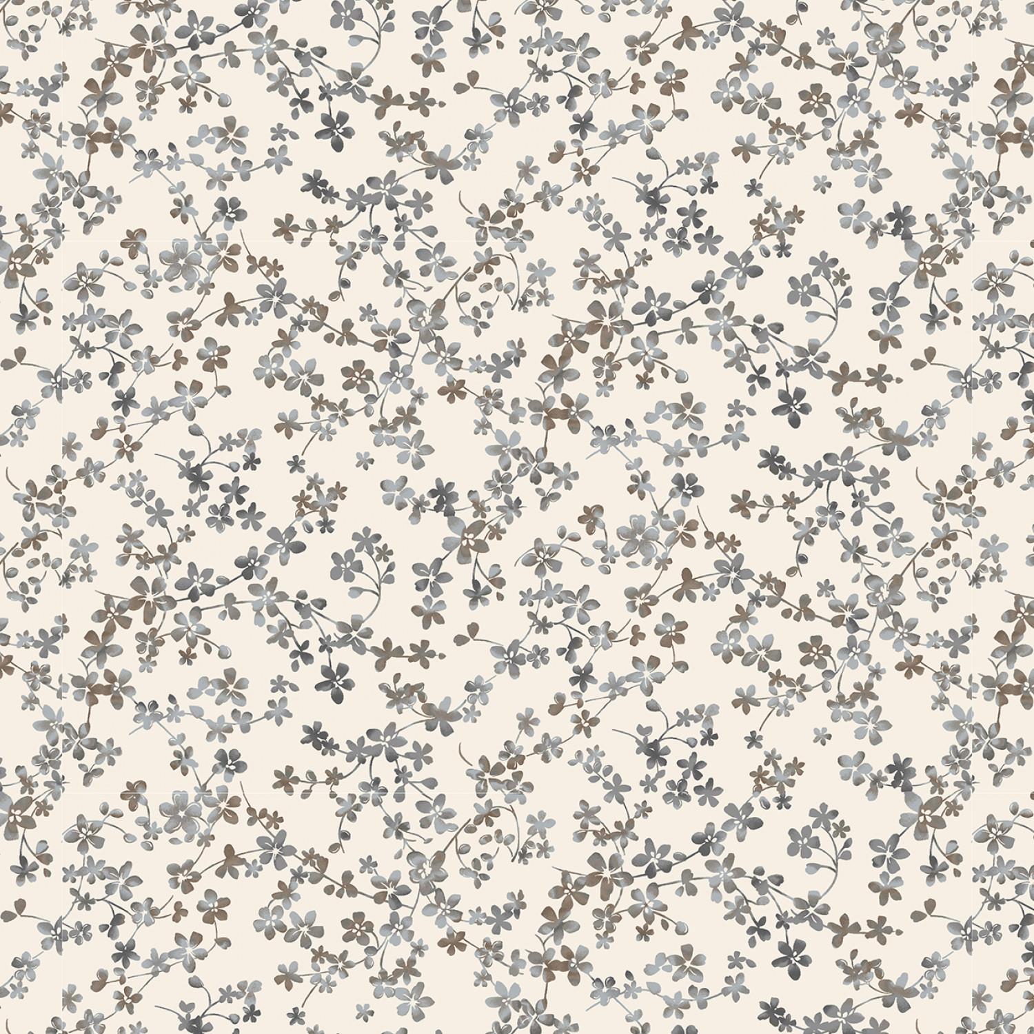 This fabric features a delicate and intricate design of small floral vines in muted tones of grey and brown, set against a soft cream background. The pattern, with an 8-inch repeat, gives a serene and timeless look, perfect for creating elegant garments, home decor, or quilting projects that require a touch of nature-inspired sophistication. The fabric's lightweight and breathable nature, thanks to its 100% cotton composition, ensures comfort and durability. 44/45" wide