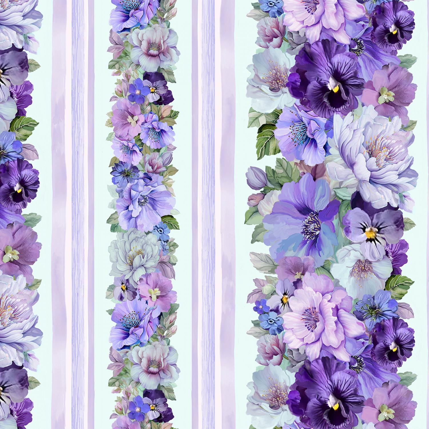 This fabric showcases a delightful design of vertical stripes adorned with an array of blooming flowers in shades of purple, lavender, and blue. The floral pattern is intricately detailed, with each flower appearing to burst from the fabric, creating a vibrant and lively appearance. The background features soft pastel hues that complement the vivid floral stripes, making this fabric perfect for projects that require a touch of elegance and nature's beauty. By Timeless Treasures 100% cotton digital print, 44/45" wide 11" Stripes