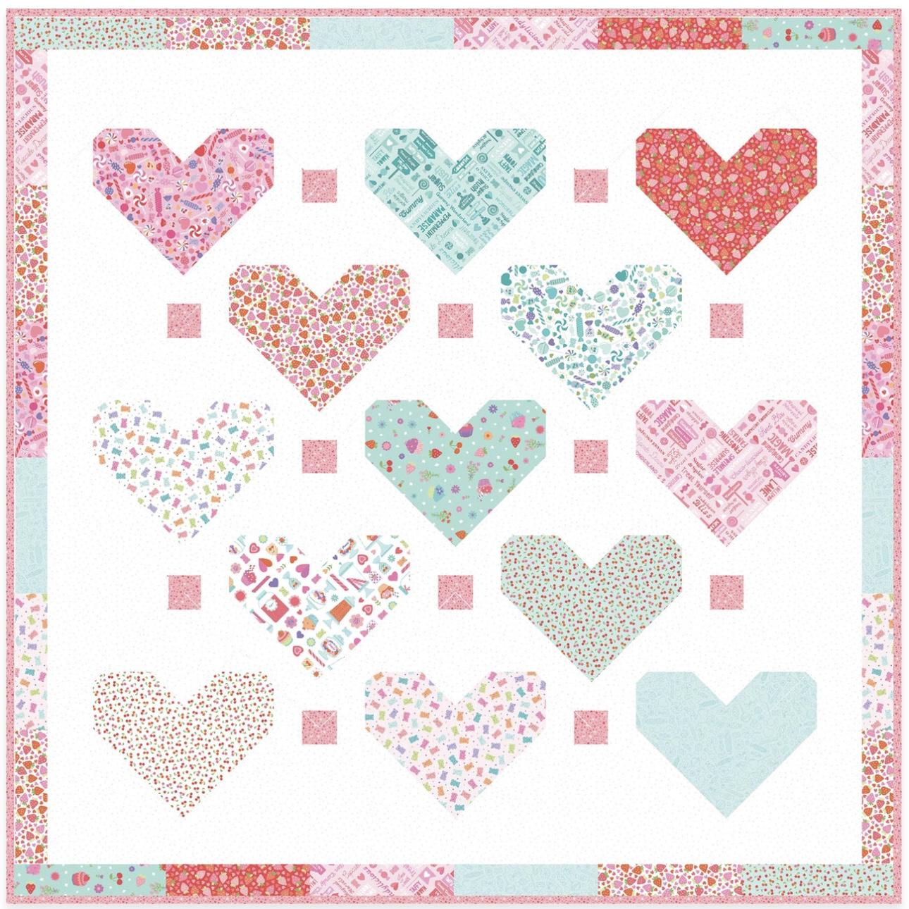 Make the Hearts on Point Quilt by Maywood Studio with fabrics from the Sweet Shoppe collection by Kimberbell. All fabrics for the top and binding are included. Finished Size: 55 1/2" x 65 1/2"