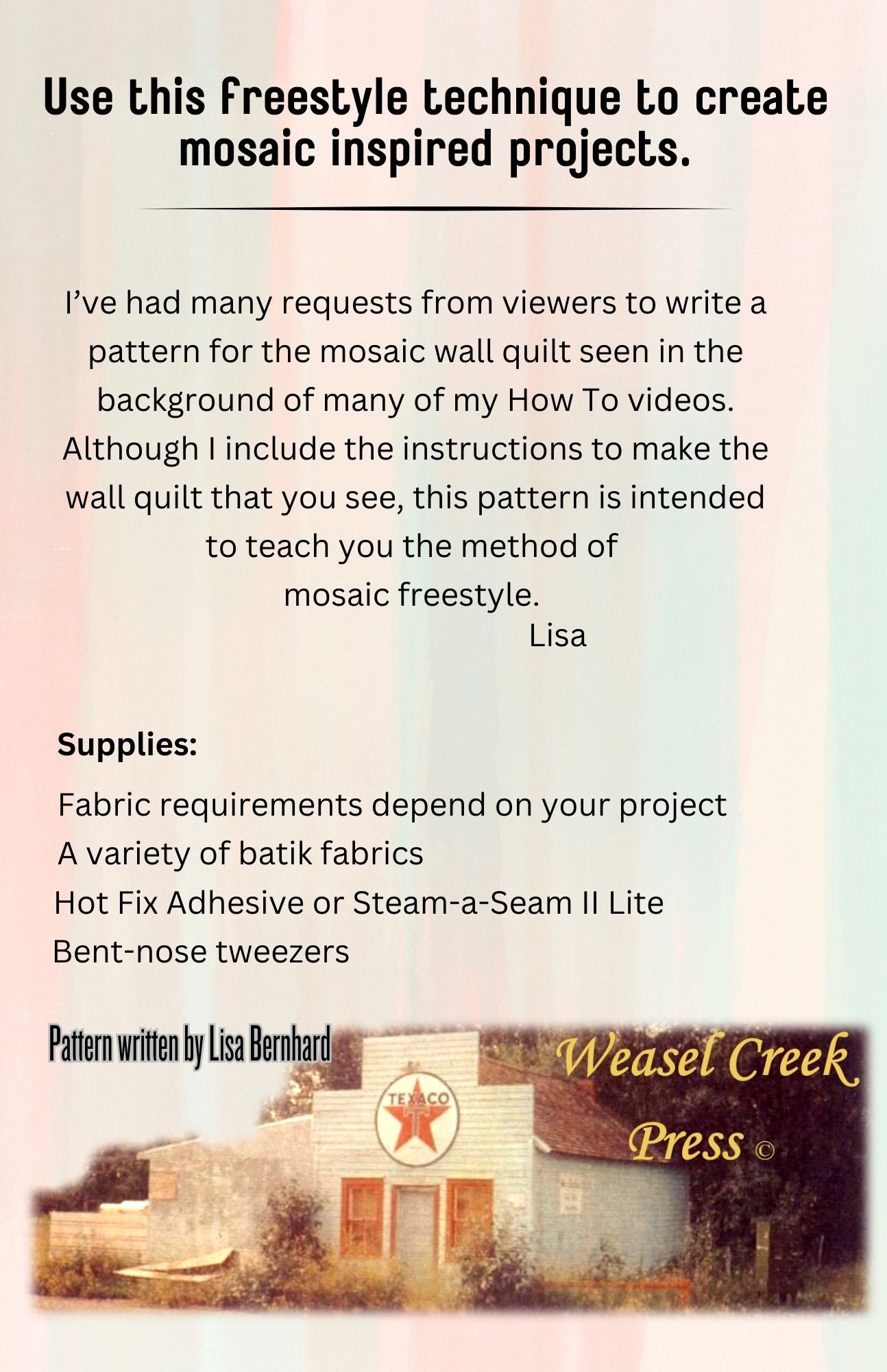 Lisa has had many requests from viewers to write a pattern for the mosaic wall quilt seen in the background of many of her How To videos. This pattern teaches the method of mosaic freestyle. Although the instructions to make the wall quilt are included, the pattern is intended to teach the method so you can make any project you like.