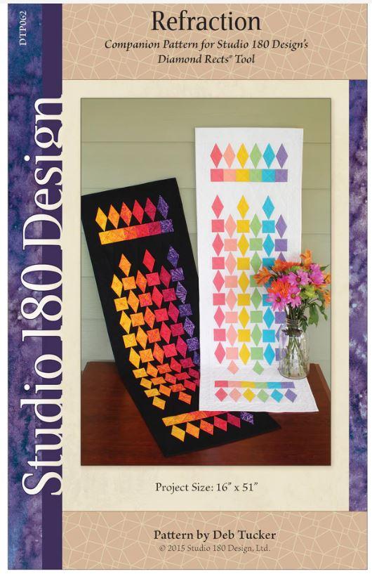 A rainbow of colors bouncing off diamonds! Using 2½” strips this table runner is fun and quick to make. Refraction is a mixture of the Diamond Rectangle units and squares, making the simple look tricky. The Diamond Rects tool allows you to make the diamonds easily and precisely. You’ll have fun making this beautiful table runner and in no time it’ll be ready to use on your table.