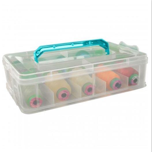 Stackable, snap together, thread container that holds 20 thread spools or separate notions in a 2" x 3" compartment.