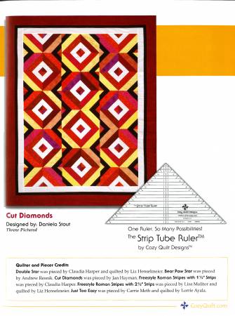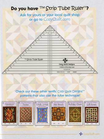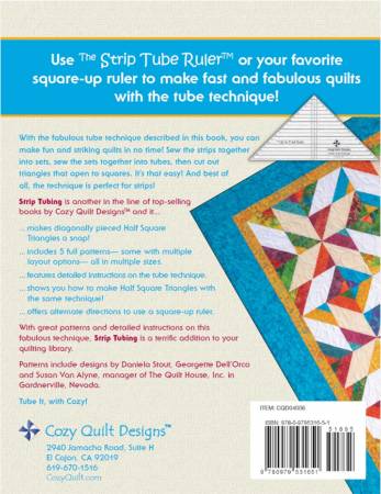 Strip Tubing is another in the line of top-selling books by Cozy Quilt Designs and it makes diagonally pieced Half Square Triangles a snap! Includes 5 full patterns - some with multiple layout options - all in multiple sizes. Features detailed instructions on the tube technique. Shows you how to make Half Square Triangles with the same technique! Offers alternate directions to use a square-up ruler. With great patterns and detailed instructions on this fabulous technique, Strip Tubing is a terrific addition to your quilting library.